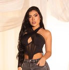 Crop top negro con escote halter cruzado y transparencias estratégicas. Sexy con clase, ideal para noches donde quieres robarte todas las miradas.